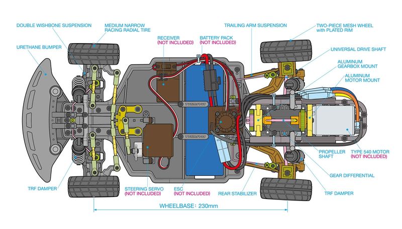 • Ausgestattet mit hochwertigen TRF-Dämpfern (Tamiya Racing Factory).
