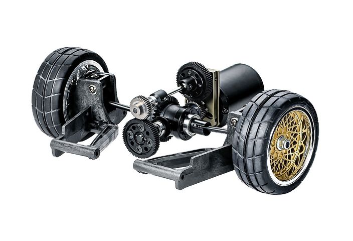 Der Motor ist mittig und längs positioniert, um die Chassis-Anordnung dem Originalfahrzeug nachzubilden. Die Kraftübertragung erfolgt wie folgt: Ritzel A ? Stirnrad ? Kardanwelle ? Ritzel B ? Stirnrad ? Differenzial. (Die Stirnräder sind in neuer 66T-Ausführung, alle Zahnräder haben Modul 04. Das Differenzial entspricht dem des TB-05-Chassis.)