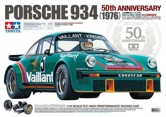 Zum 50. Jubiläum des ersten ferngesteuerten Porsche 934-Modells von Tamiya präsentiert sich dieser exklusive Bausatz in limitierter Auflage. Er bildet den legendären Porsche 934 mit einem speziell angefertigten Chassis nach, dessen Motor längs mittig im Heck positioniert ist und die Hinterräder antreibt – genau wie beim Original. Für Sammler und Vitrine-Liebhaber sind magnetische Karosseriehalterungen enthalten, die keine Karosseriebohrungen benötigen. So lässt sich das Modell perfekt präsentieren. Jedes Set ist mit einer individuellen Nummerierung versehen.